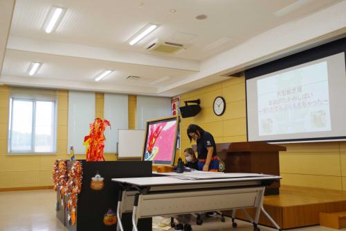 料理中に火を使用しているときは目を離さないこと、天ぷら鍋から火災が発生してしまった時の対処法について、女性消防団員が手作りした紙芝居で学びました。