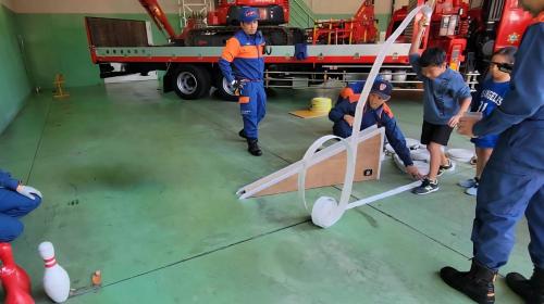 車両の体験搭乗や展示、放水体験をはじめ、今回初めて実施した「ホースボウリング」や廃棄ホースを活用した「コースター作り」は大好評で、子どもたちが楽しみながらも真剣に取り組む姿や、職員に対して現場活動や訓練、資機材について質問する場面も多く見られ、消防の仕事をより身近に感じていただく良い機会となりました。